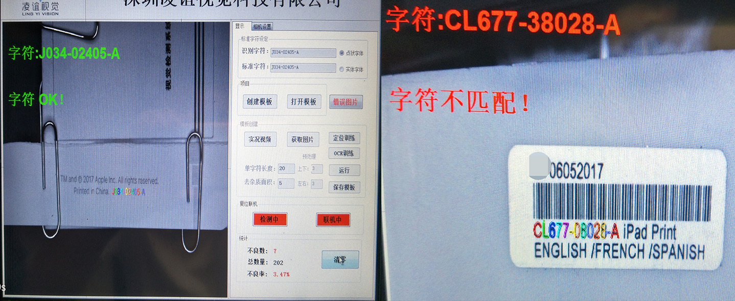 本字符識別系統(tǒng)常用于配合產(chǎn)品外包裝或產(chǎn)品說明書單頁上的字符識別防混,通過對料號字符的識別實現(xiàn)防止錯料混料的發(fā)生。系統(tǒng)可適用于手工線或自動線,具有識別速度快、準確率高的優(yōu)點,有助于提高客戶良品率及生產(chǎn)效率。杜絕不良品流出導致的產(chǎn)品召回。